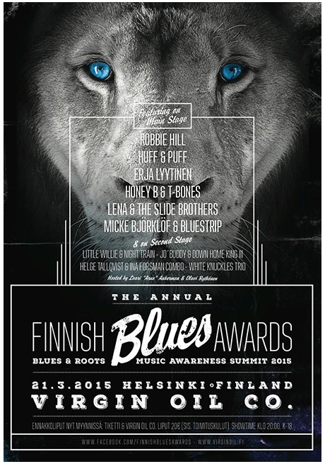Bluespokaaleja jaossa Virgin Oilissa. Kotimaisen blues- ja roots-musiikin ansioituneita työmyyriä ja taitajia muistetaan sekä tehdään entistäkin tunnetummaksi uuden Finnish Blues Awards -palkintogaalan merkeissä Helsingin Virgin Oil Co:ssa 21. maaliskuuta. Alan toimijoiden yhteistyönä järjestämässä tapahtumassa esiintyvät mm. Erja Lyytinen, Honey B & T-Bones, Micke Björklöf & Blue Strip, Marjo Leinonen Huff 'n' Puff, Jo' Buddy & Down Home King III, Robbie Hill sekä Lena & The Slide Brothers. Tilaisuuden